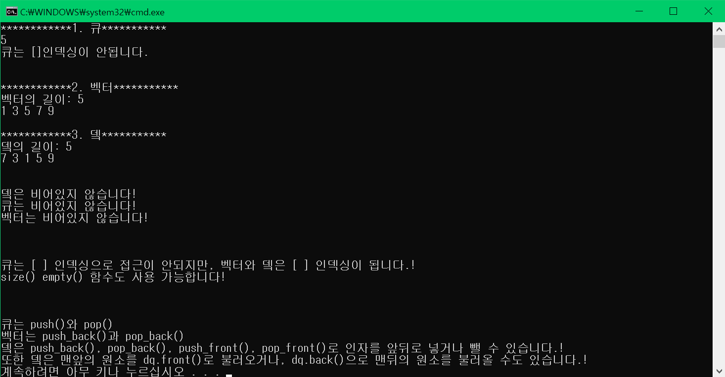 cout << "큐는 [ ] 인덱싱으로 접근이 안되지만, 벡터와 뎈은 [ ] 인덱싱이 됩니다.!\n";