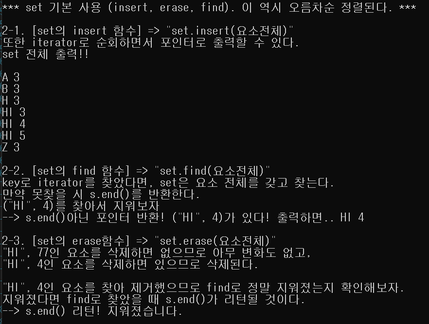 아래의 실행화면과 함께 보자 (map은 45줄까지, set은 그 이후부터)